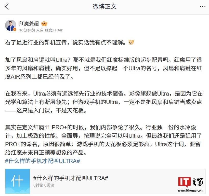 IT之家 2 月 2 日消息,红魔游戏手机产品总经理姜超今日发文,表达了自己对最近行业的新机宣传的“不理解”,反问加了风扇和肩键就叫 Ultra?称就是红魔标准版的起步配置。