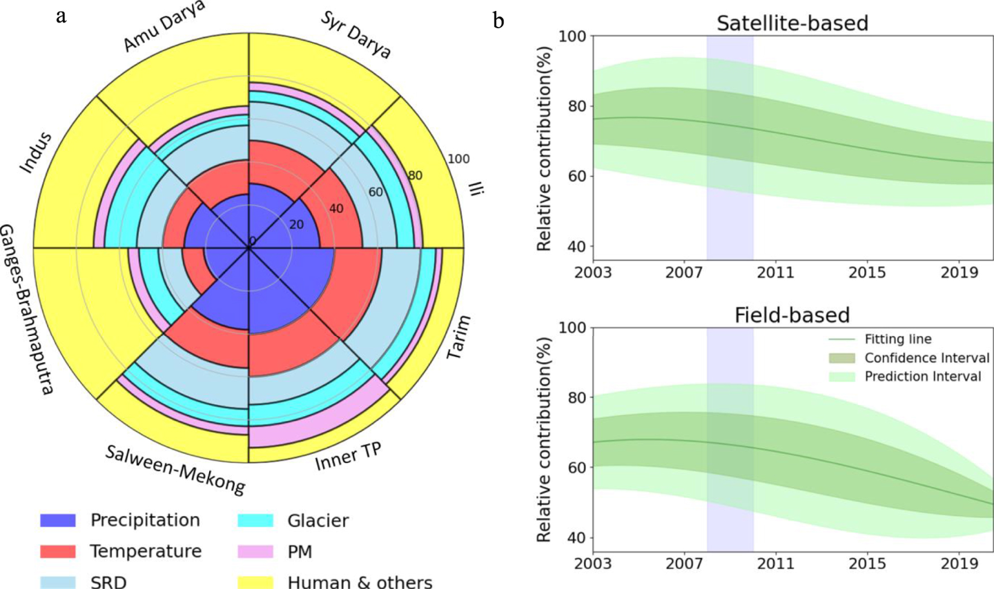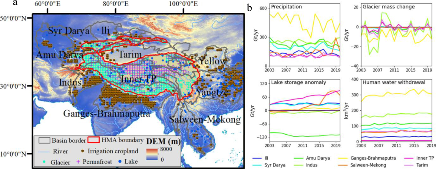 研究表明,气候因素(如全球变暖导致的冰冻圈退缩)导致了近一半的地下水储量变化,但以下游灌溉为主的人类活动导致该过程加速。