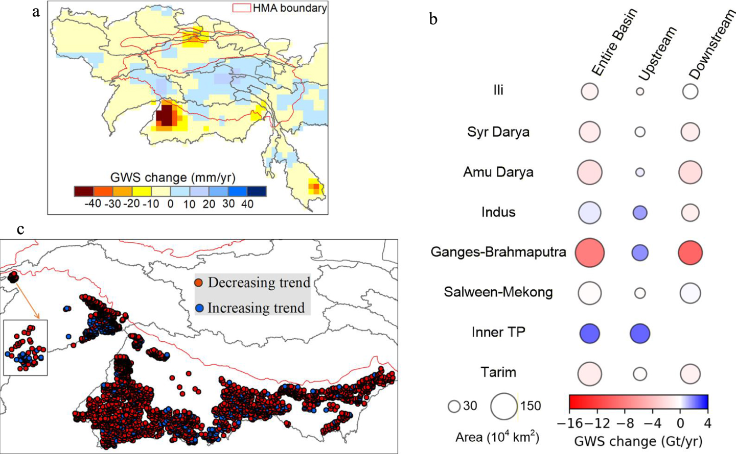 研究发现,2003 年至 2020 年间,约三分之二的高亚洲地区经历了地下水储量下降,其中以人口稠密、灌溉密集的下游区域最为显著,如恒河-布拉马普特拉河流域、印度河与阿姆河盆地。