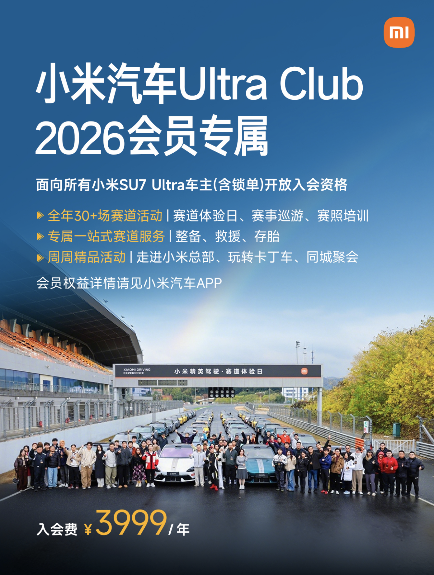 IT之家 2 月 2 日消息,据小米汽车官方微博,小米汽车宣布 2026 年 UltraClub 会员权益再升级(入会费为 3999 元),老会员在有效期内完成续费,前 1000 名每人可获赠一张 1299 元小米汽车无忧服务包立减券;新老会员每月都可以获得一张小米汽车 App 商城满减优惠券。