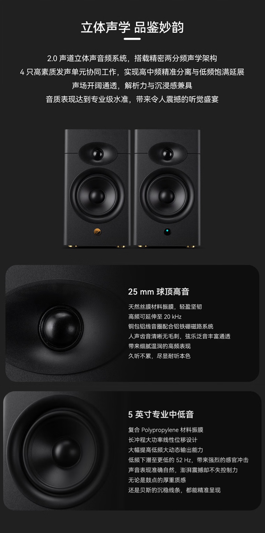 规格方面,这款产品搭载 25mm 球顶单元,高频可延伸至 20kHz,带有给铜包铝音圈、铝铁硼磁路系统,还带有 5 英寸专业中低音单元,采用复合 Polypropylene 材料振膜,大幅度提升高低频动态输出能力,低频可下潜至 52Hz。