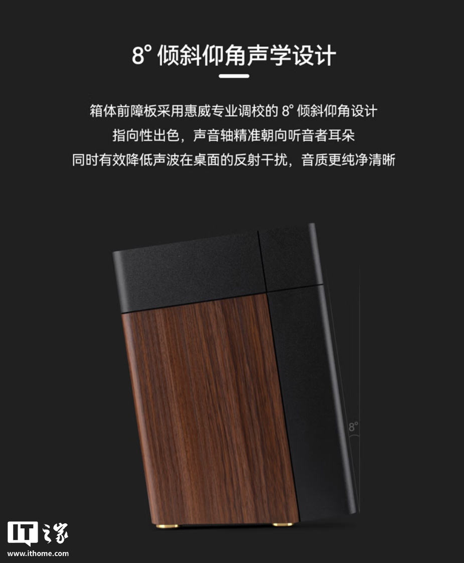 据介绍,这款产品采用简约设计,配备低谐振箱体结构、金属防震脚垫,可减少共振带来的音染,前面板采用 8° 倾斜仰角设计,可让声音轴朝向听音者耳朵,有效降低声波在桌面的反射干扰。