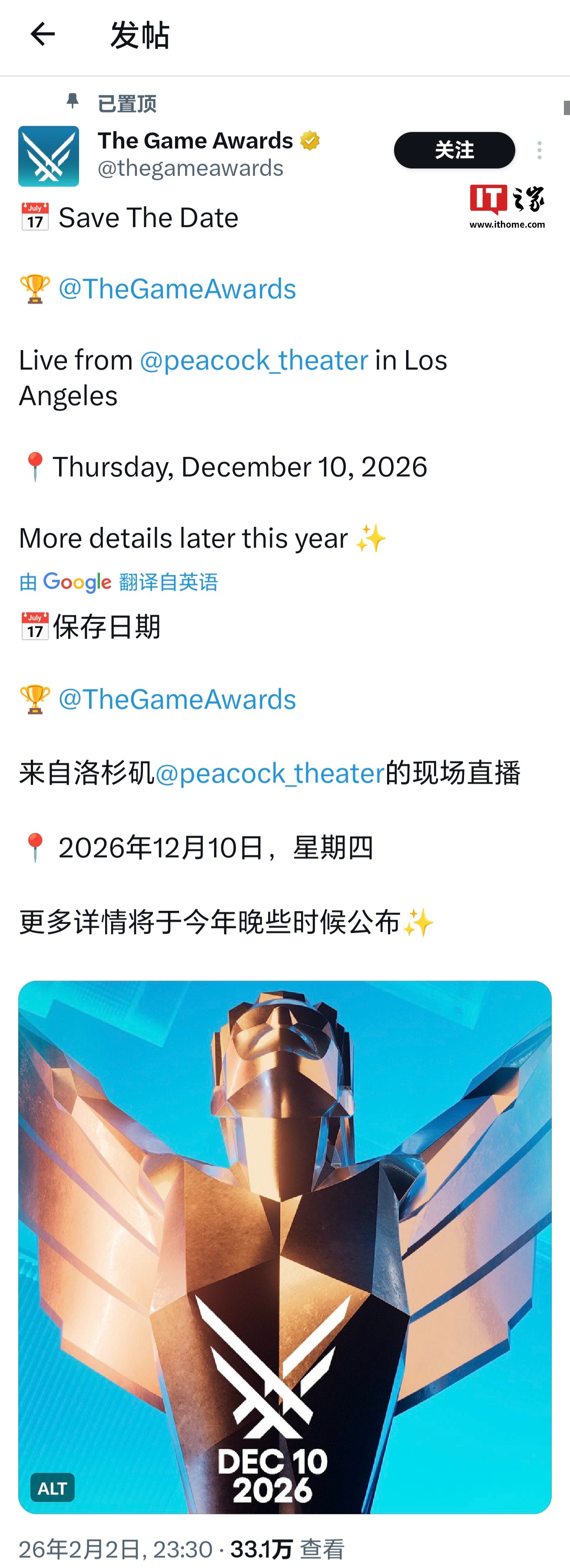 IT之家 2 月 3 日消息,TGA 官方公布了 2026 年 TGA 年度游戏颁奖典礼的颁奖时间,今年的 TGA 将于当地时间 12 月 10 日(北京时间 12 月 11 日)在洛杉矶举行,和往年一样也将进行全程现场直播。
