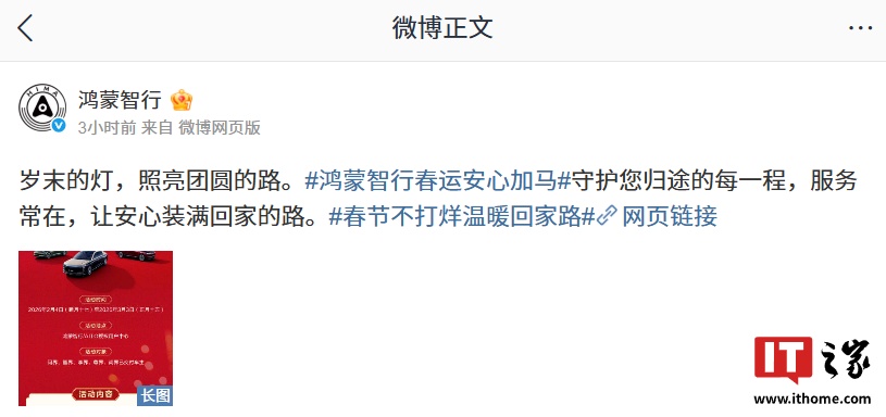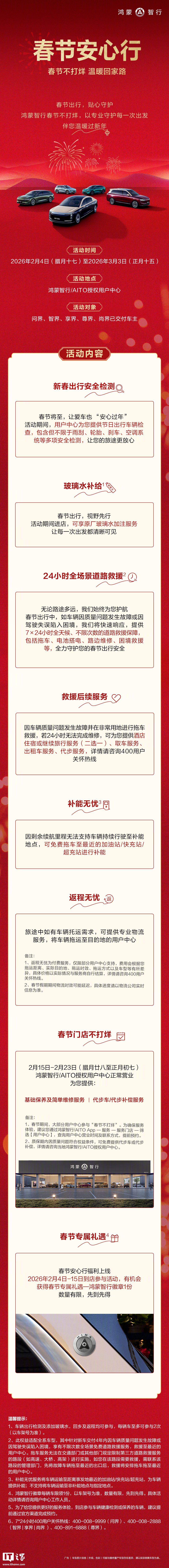 IT之家 2 月 3 日消息,鸿蒙智行官方今日宣布推出春节安心行活动,宣称“春节不打烊”,支持新春出行检测、24 小时全场景道路救援等,活动时间为 2 月 4 日-3 月 3 日。