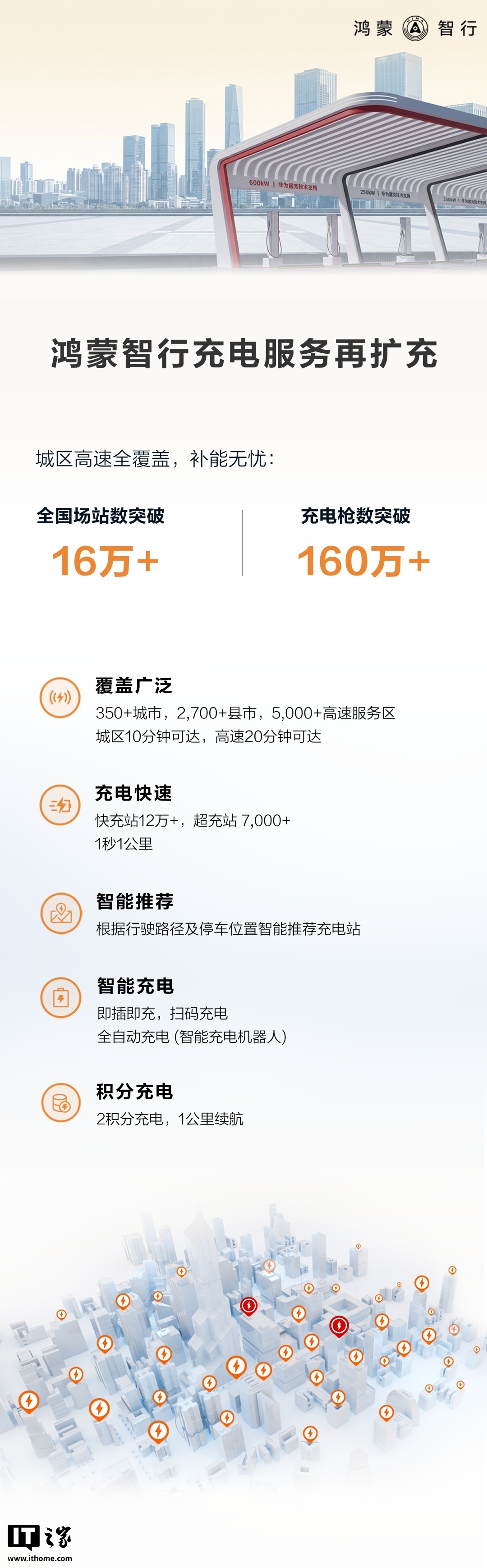 据IT之家昨日报道,鸿蒙智行还宣布充电网络再扩充,全国场站数量突破 16 万,充电枪数突破 160 万。目前,鸿蒙智行的充电服务已经覆盖超 350 座城市、超 2700 县市、超 5000 座高速服务区,城区 10 分钟可达,高速 20 分钟可达;同时,上线超 12 万座快充站、超 7000 座超充站。