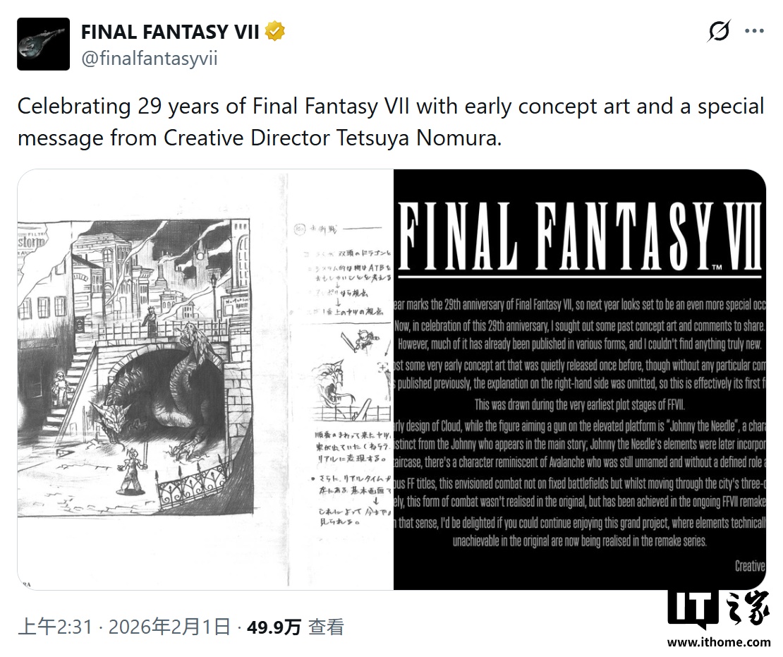IT之家 2 月 3 日消息,游戏媒体 The Gamer 于 2 月 1 日发布博文,报道称为庆祝《最终幻想 7》(Final Fantasy 7)发售 29 周年,角色设计师野村哲也公开了珍贵的早期概念图,并披露了原版游戏的开发秘闻。