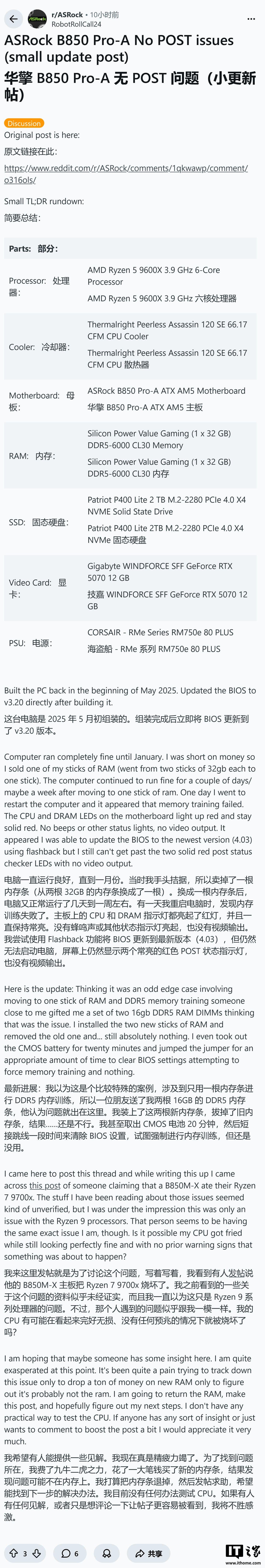 用户 u/RobotRollCall24 报告称,其使用的华擎 B850 Pro-A 主板即便已升级至最新的 4.03 版本 BIOS,依然导致了 Ryzen 9600X 彻底损坏,无法开机。