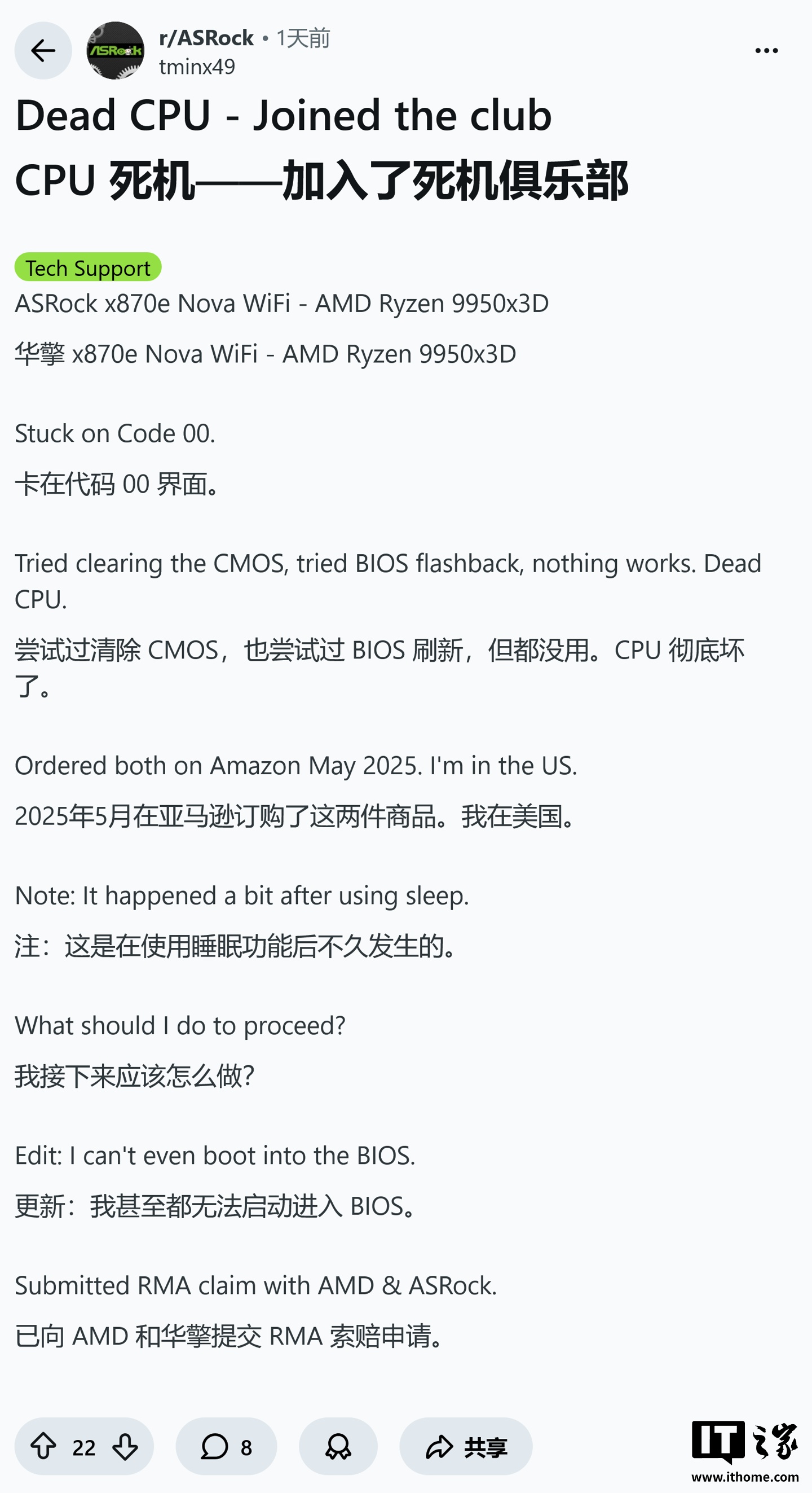 用户 u/tminx49 的顶级旗舰 Ryzen 9 9950X3D 也在华擎 X870E Nova WiFi 主板上“暴毙”。该用户的系统自 2025 年 5 月起运行,如今主板直接显示代表“CPU 故障”的“00”错误代码,目前该用户已被迫申请售后服务(RMA)。
