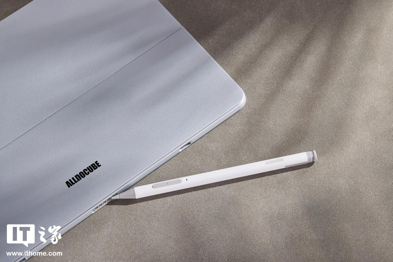另外大家还可以选配另购的 4096 级压感手写笔,手写笔类似正常的签字笔设计,笔身有棱角,握持时比较扎实,笔尖上方还有两枚功能按键。