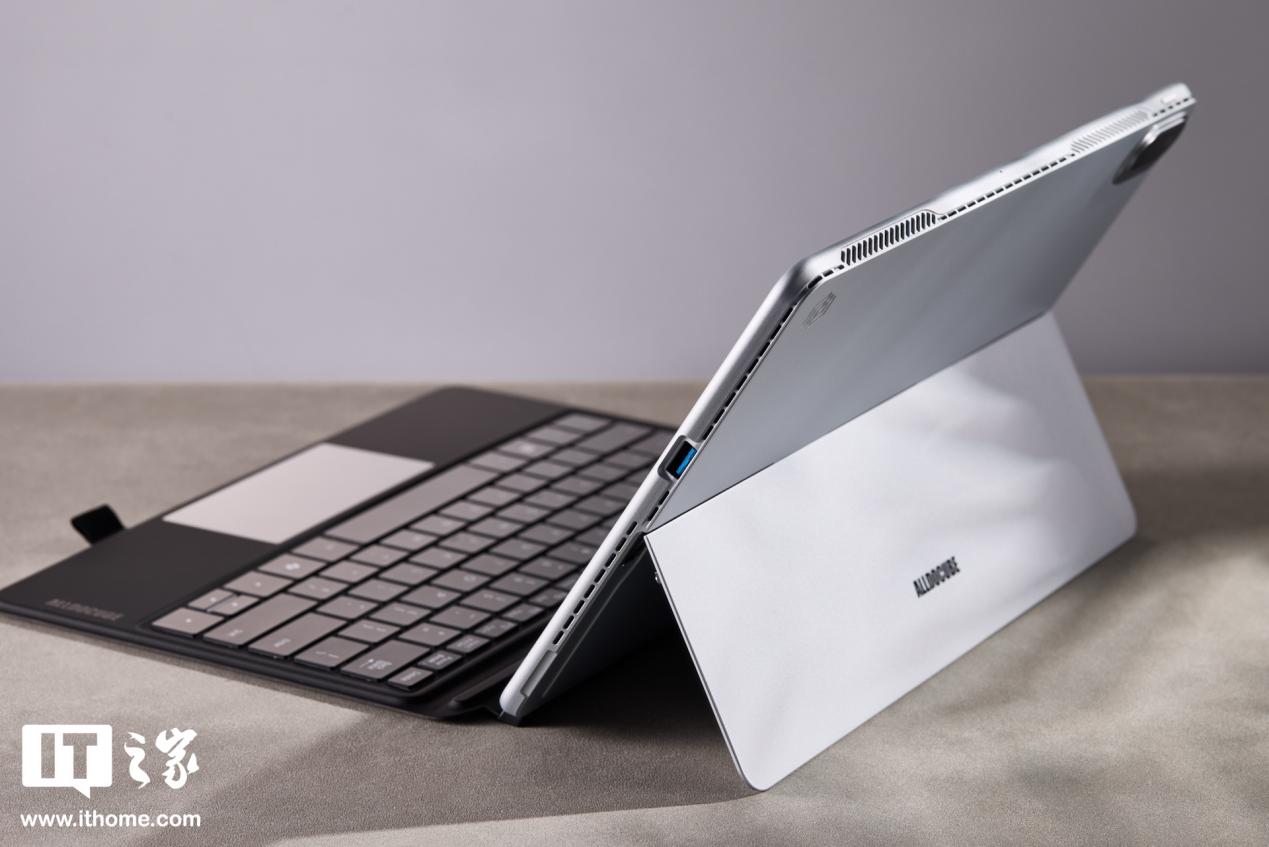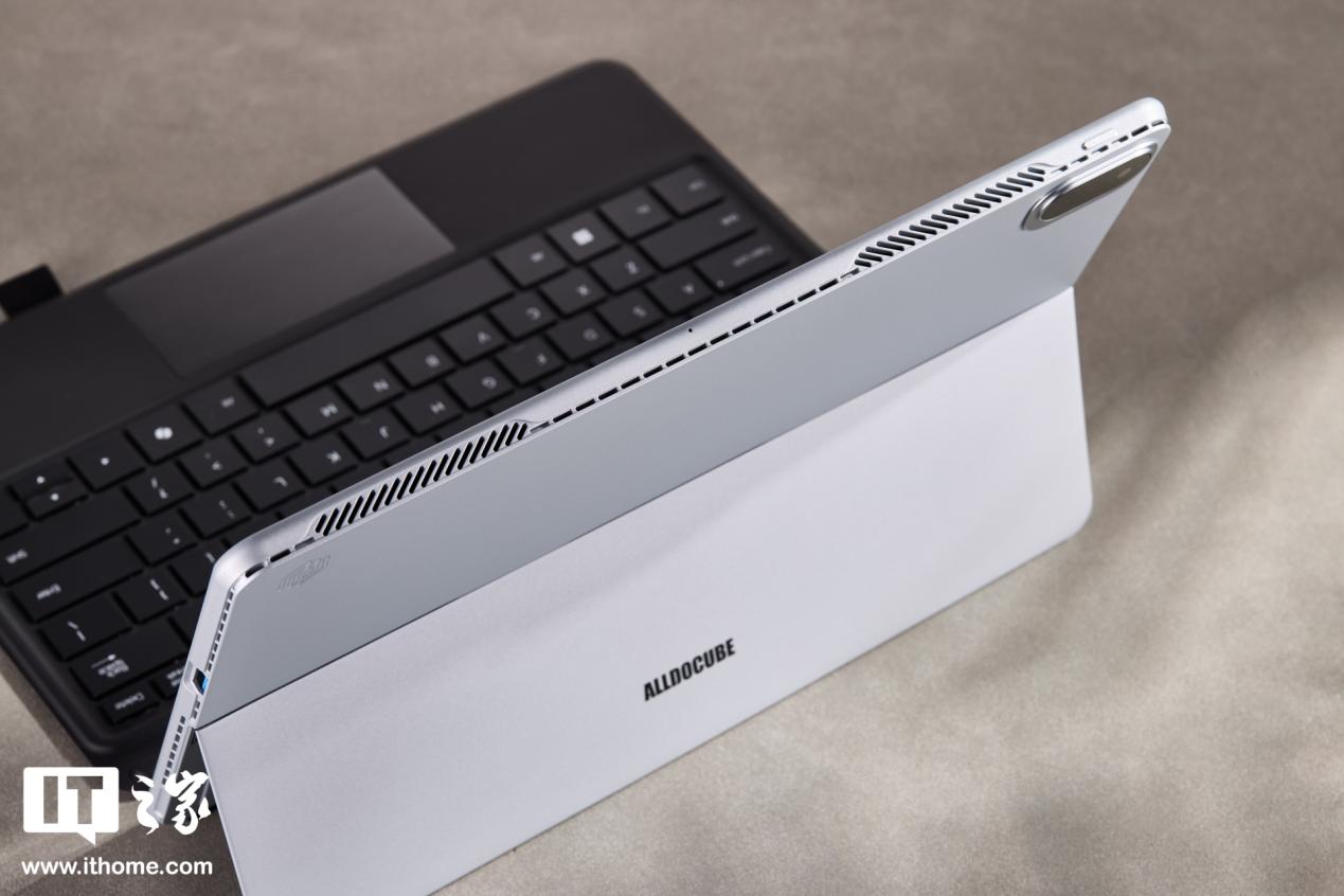 酷比魔方 iWork GT Ultra 自带铰链支架,支持最大 155° 超大开合角度,多角度可悬停,从而适应不同的应用场景。支架展开时的阻尼感还是比较明显的,不会太松,掰起来也不会太费劲。