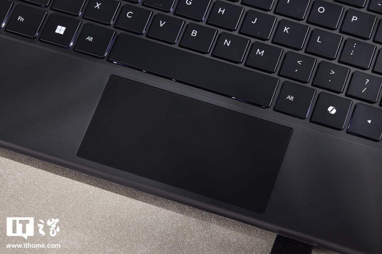 酷比魔方 iWork GT Ultra 标配 Pogo Pin 智能磁吸键盘,键盘为黑色,设计紧凑,按键手感尚可,键程适中,按压回馈明显。键盘下方区域是触控板,周围掌托部分表面为亲肤的软胶材质,整体来说,应对一些轻量的办公打字还是轻轻松松的。
