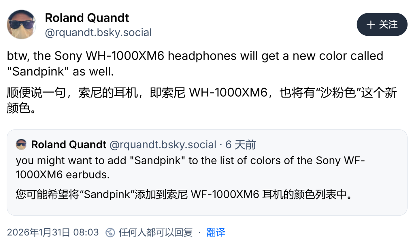 IT之家 2 月 3 日消息,消息人士 Roland Quandt 上周(1 月 31 日)在社交媒体 BlueSky 透露,索尼将推出“柔沙粉”(Sandpink)配色的 WH-1000XM6 头戴式耳机。