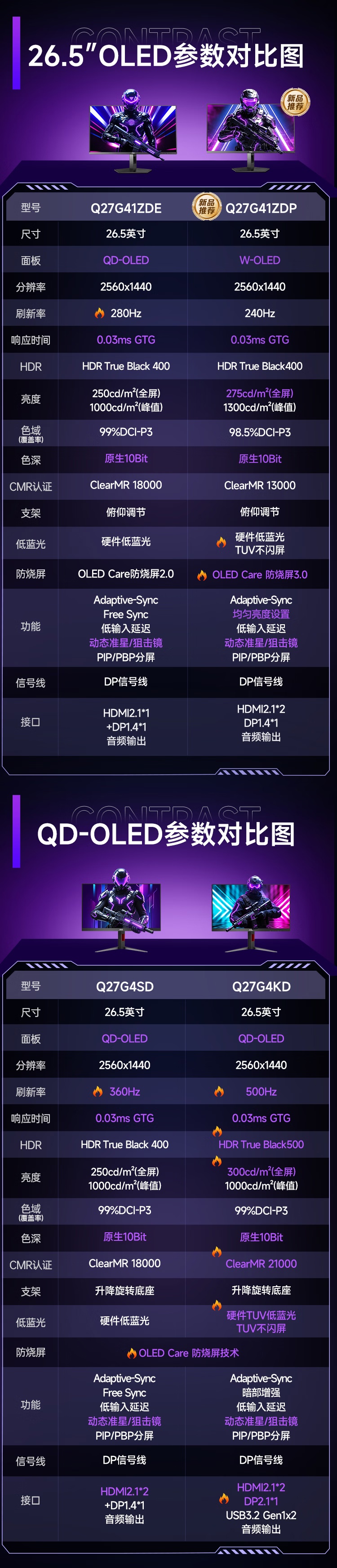 这款显示器搭载 AGLR 防眩光低蓝光技术,GtG 响应时间 0.03ms,峰值亮度可达 1500nits,获得 VESA DisplayHDR True Black 400 认证,覆盖 100% sRGB、99.5% DCI-P3 色域,色差 ΔE<2。
