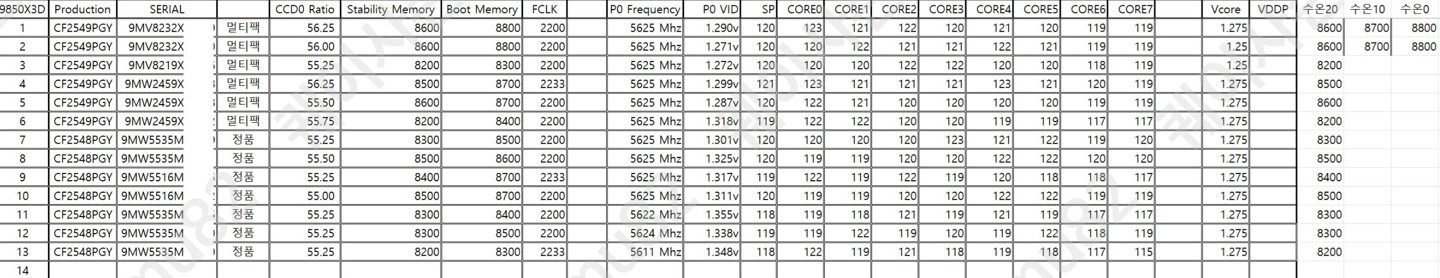 IT之家 2 月 3 日消息,网友 sugi0lover 于 2 月 1 日在 Overclock 论坛发帖,基于 13 颗 AMD Ryzen 7 9850X3D 处理器体质测试(Binning)数据,该处理器本质上是出厂预超频的 9800X3D。