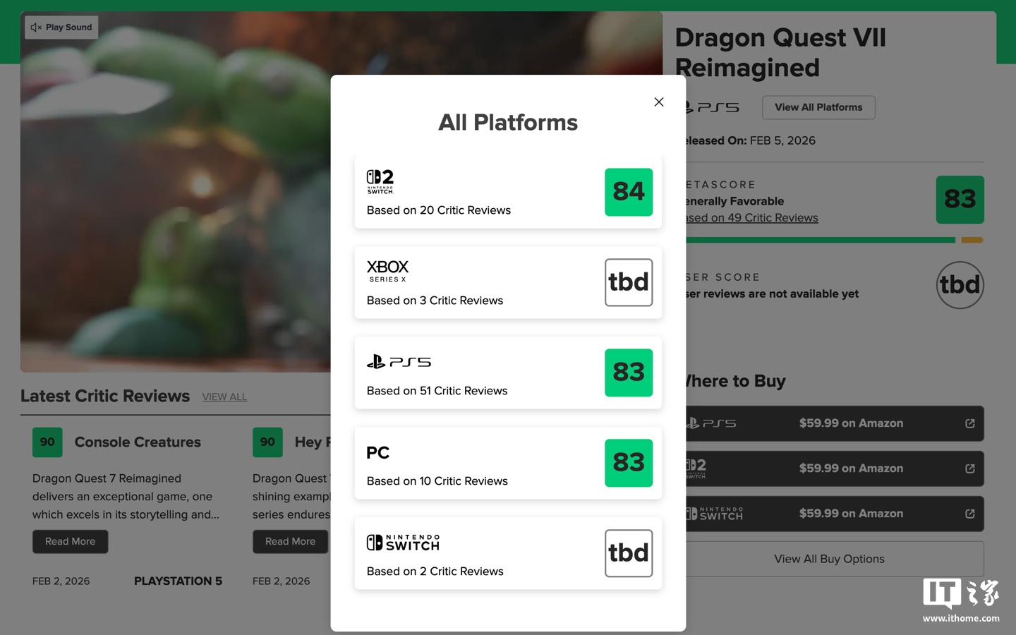 IT之家 2 月 3 日消息,Square Enix 旗下经典 RPG 重制作《勇者斗恶龙 7 Reimagined(Dragon Quest VII Reimagined)》将于 2 月 6 日发售,目前游戏全球媒体评测已解禁。截至IT之家发稿,本作在 Metacritic 平台 PS5 版均分 83(暂由 49 家媒体给出),Switch 2 版 84 分(暂由 20 家媒体给出)。