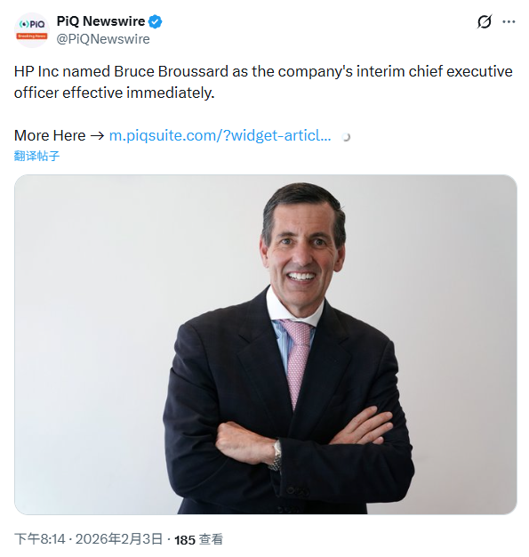 由于 Enrique Lores 已辞去惠普总裁兼 CEO 及董事会成员职务,惠普同时也宣布任命布鲁斯 · 布鲁萨德(Bruce Broussard)任临时 CEO,即刻生效。另外,惠普将于 2026 年 2 月 24 日公布 2026 财年第一季度财报。