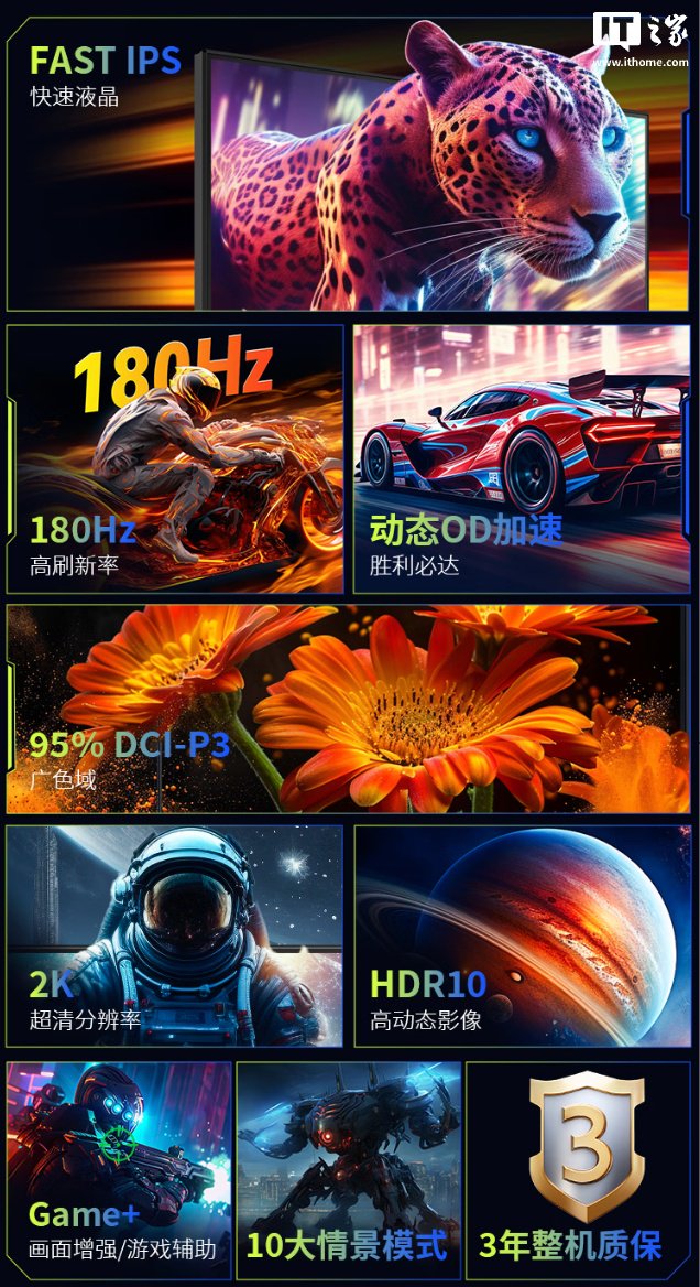 该机配备一块 2560x1440 分辨率 180Hz Fast IPS 面板,显示器亮度 350 尼特,静态对比度 1000:1,显示器支持 10-Bit 色彩(8-Bit + FRC),覆盖 95% DCI-P3、87% Adobe RGB、99% sRGB 色域。