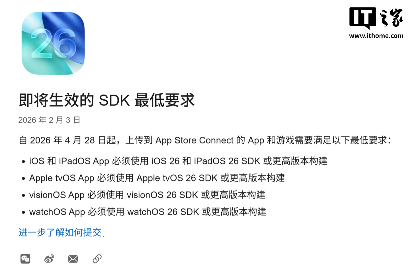 IT之家 2 月 4 日消息,苹果开发者官网昨日(2 月 3 日)发布公告,宣布自 2026 年 4 月 28 日起,上调提交至 App Store 的应用的 SDK 门槛。