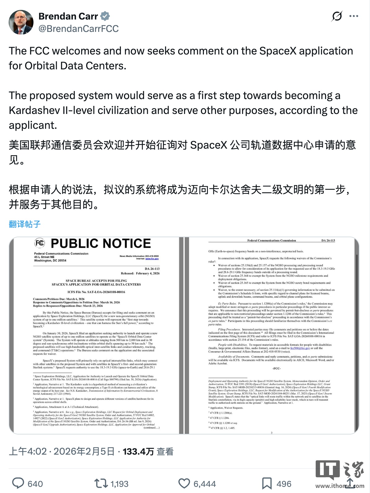 美国联邦通信委员会主席布伦丹 · 卡尔(Brendan Carr)在 X 平台发文称:“FCC 欢迎 SpaceX 公司提交的轨道数据中心申请,并面向公众征询。根据申请人的说法,拟议的系统将是迈向卡尔达舍夫 II 级文明的第一步,并可实现其他目标。”