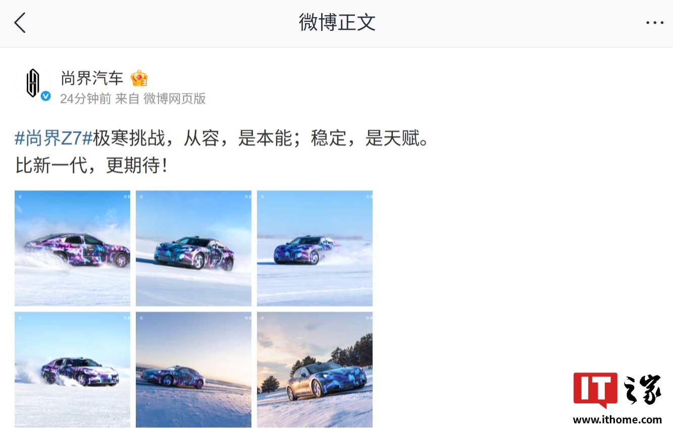 IT之家 2 月 5 日消息,鸿蒙智行尚界汽车官方今日发布了尚界 Z7 轿跑官图(贴有伪装车衣),从图片和微博配文来看,尚界 Z7 已开启冰雪极端环境测试。后续还有望发布实车冬测视频。