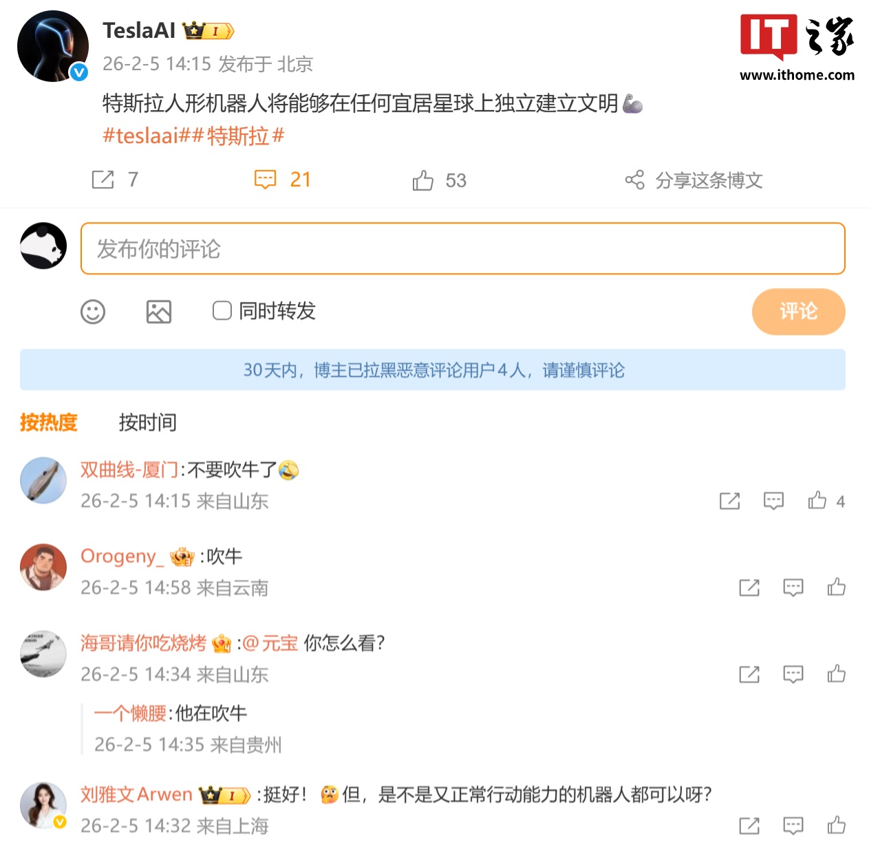 IT之家 2 月 5 日消息,特斯拉官方账号 @TeslaAI 今日发文称,特斯拉人形机器人将能够在任何宜居星球上独立建立文明。