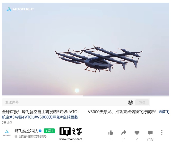 IT之家 2 月 5 日消息,峰飞航空自主研发的全球首款 5 吨级 eVTOL —— V5000 天际龙正式发布,并在峰飞航空白莲湖低空基地成功完成转换飞行演示。据悉,这也是全球最大 eVTOL。