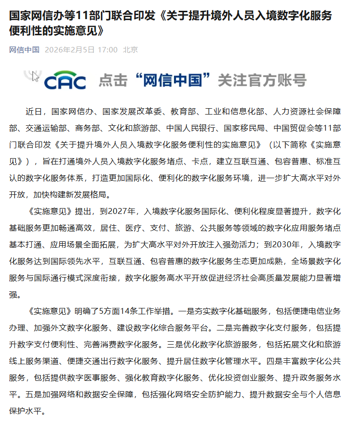IT之家 2 月 5 日消息,近日,国家网信办、国家发展改革委、教育部、工业和信息化部、人力资源社会保障部、交通运输部、商务部、文化和旅游部、中国人民银行、国家移民局、中国贸促会等 11 部门联合印发《关于提升境外人员入境数字化服务便利性的实施意见》(以下简称《实施意见》),旨在打通境外人员入境数字化服务堵点、卡点,建立互联互通、包容普惠、标准互认的数字化服务体系,打造更加国际化、便利化的数字化服务环境,进一步扩大高水平对外开放,加快构建新发展格局。
