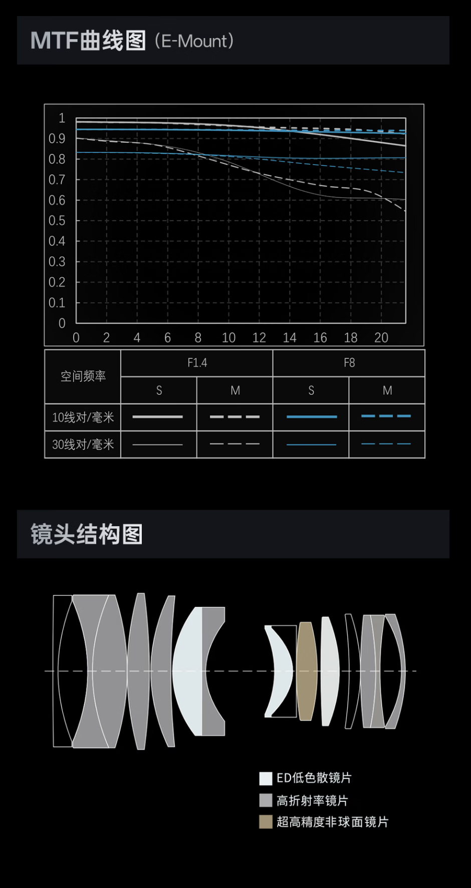 该镜头采用防尘防泼溅设计,整体重量 830 克,镜身配备光圈有级 / 无极切换开关和对焦模式开关。镜头采用 11 组 15 片光学结构,匹配 11 片光圈叶片,镜头搭载双重 HyperVCM 马达实现高效自动对焦,支持相机人脸、人眼识别对焦等功能,最近对焦距离 0.45 米。