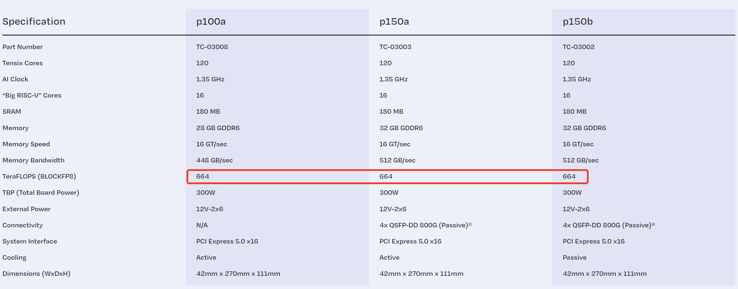 该媒体对比官网新旧产品页面的数据,Blackhole p150 的理论算力峰值已从 774 TFLOPS 骤降至 664 TFLOPS。对于追求极致算力的开发者而言,14% 的理论算力蒸发绝非小事,尤其是在多卡互联的集群环境中,这种损失会被进一步放大。