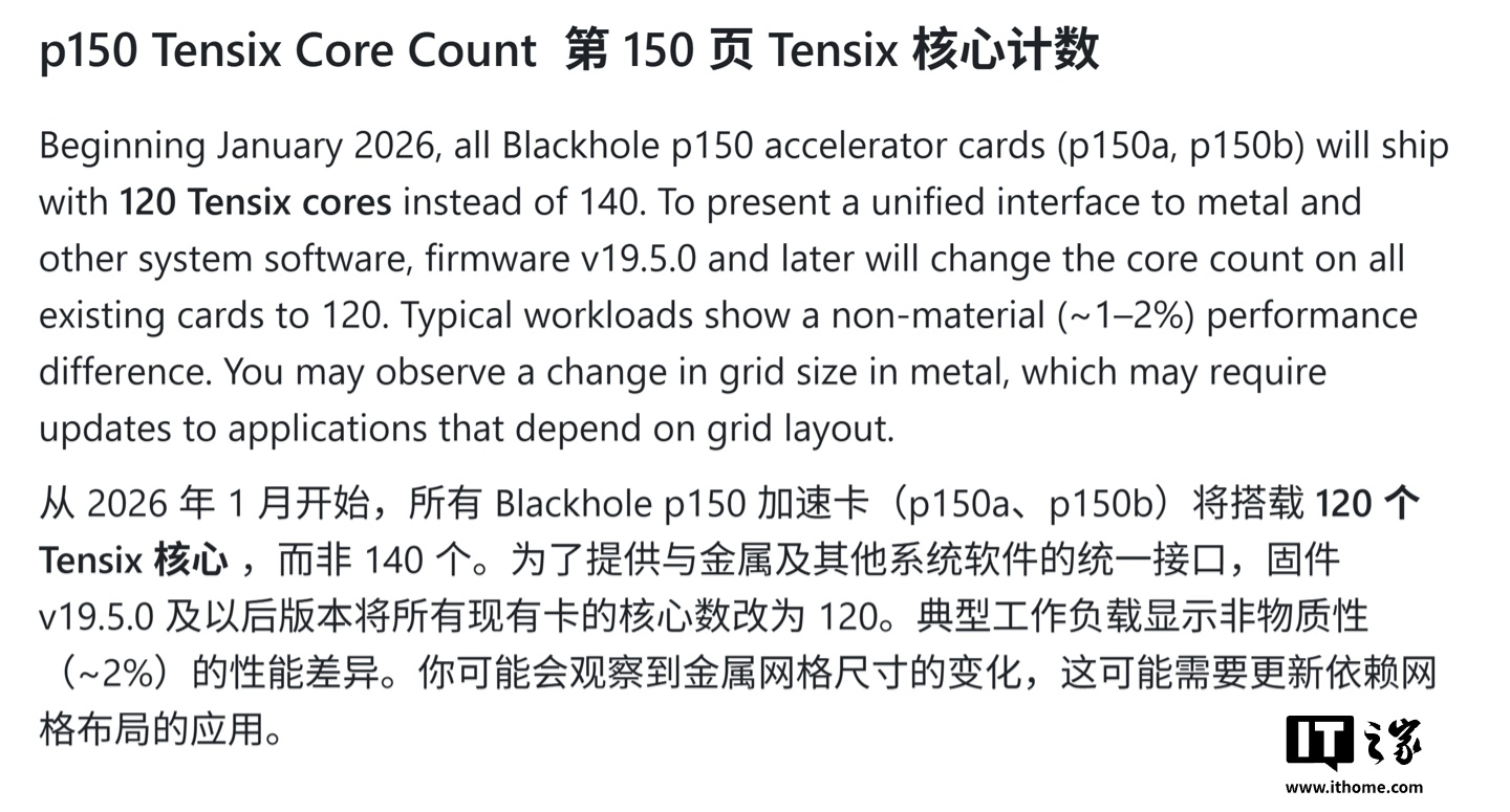 Tenstorrent 在发给客户的邮件及 GitHub 更新日志中指出,从 2026 年 1 月起,所有 p150 系列加速卡出厂将仅标配 120 个核心。IT之家附上相关截图如下: