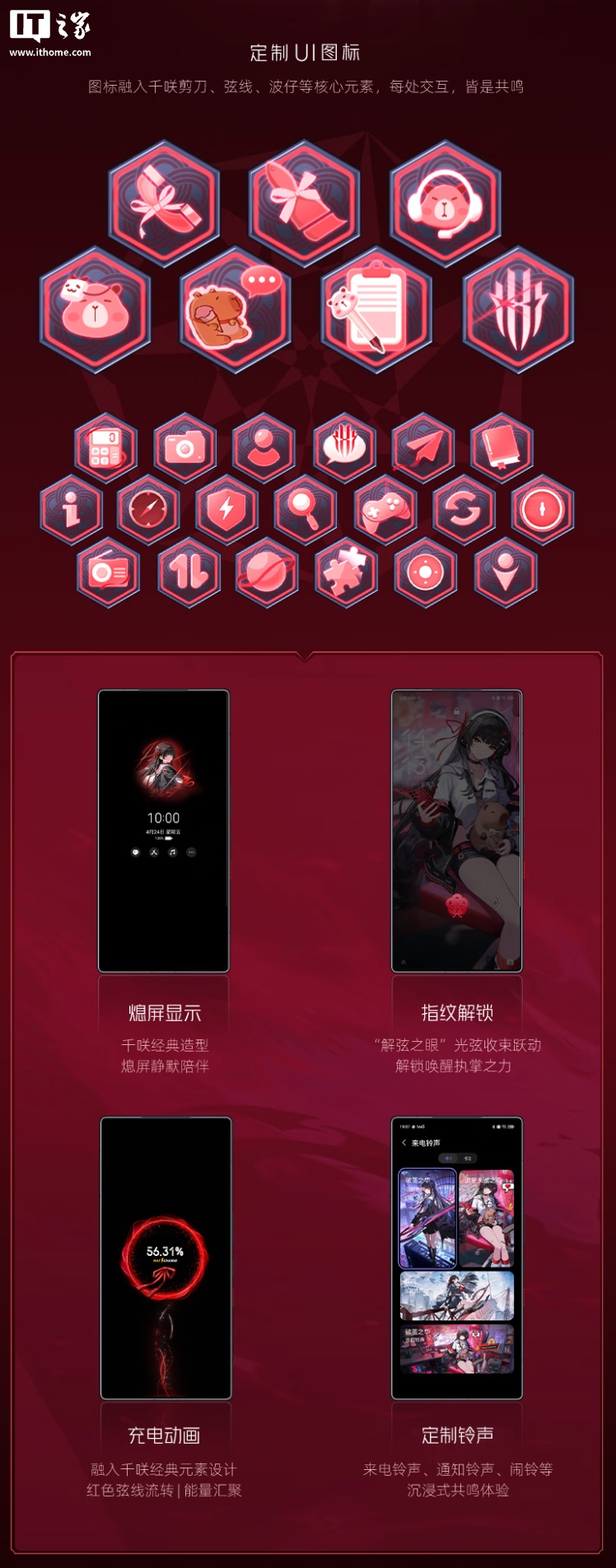 据介绍,这款红魔 11 Pro+ 鸣潮限定版以“共鸣者・千咲”为设计原点,将其标志性的技能元素化身为视觉核心,令弦线交织于红色透明背板上,同时机身复刻了千咲经典黑红配色。在系统方面引入了联名定制千咲主题,包括图标 / 熄屏显示 / 铃声 / 充电动画均进行了定制处理。