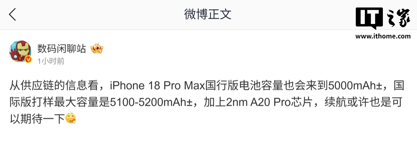 IT之家 2 月 6 日消息,博主 @数码闲聊站 今天在微博表示,从供应链信息来看,苹果 iPhone 18 Pro Max 国行版电池容量将达到 5000mAh±。