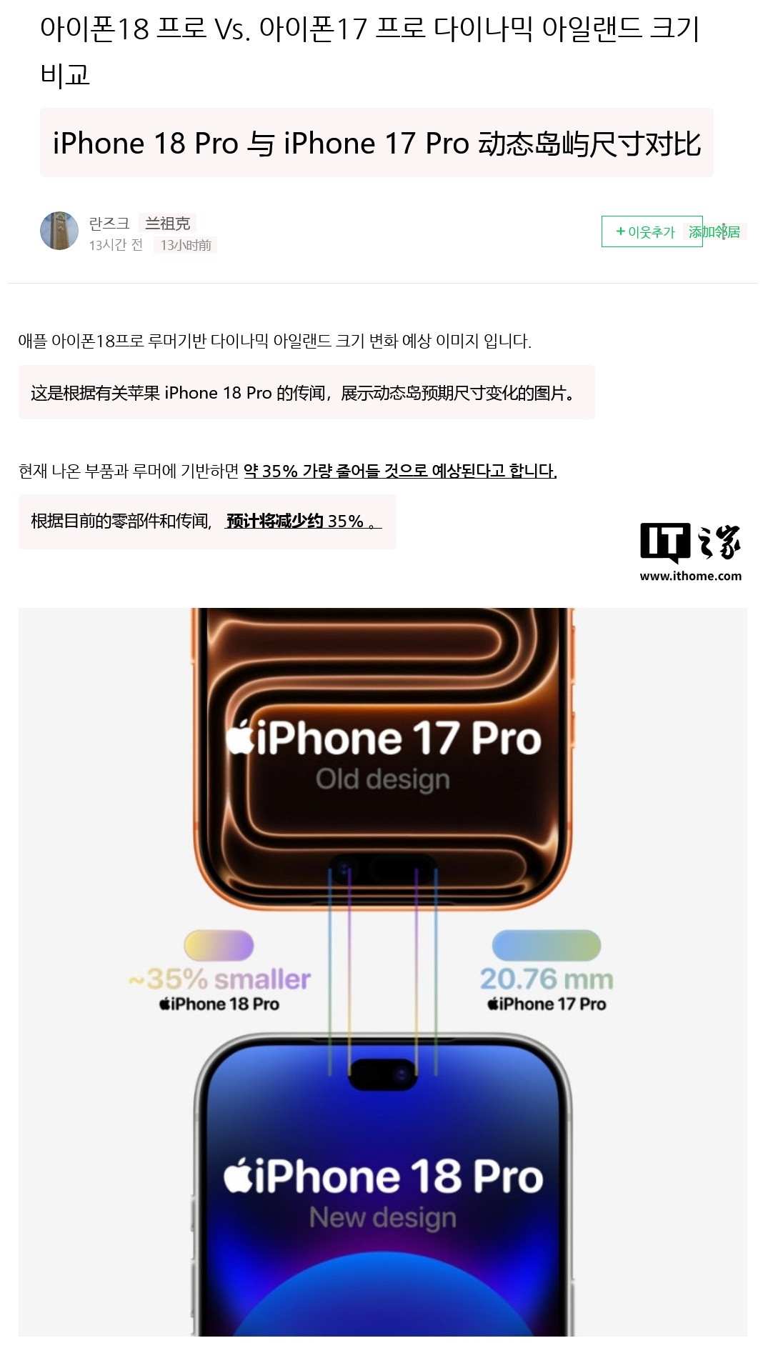 结合IT之家此前报道,消息源 yeux1122 曾透露苹果正加速迈进“全面屏”设计,今年秋季发布的 iPhone 18 Pro / Pro Max 的灵动岛区域开口宽度从 20.76mm 缩短至 13.49mm,缩减幅度约为 35%。