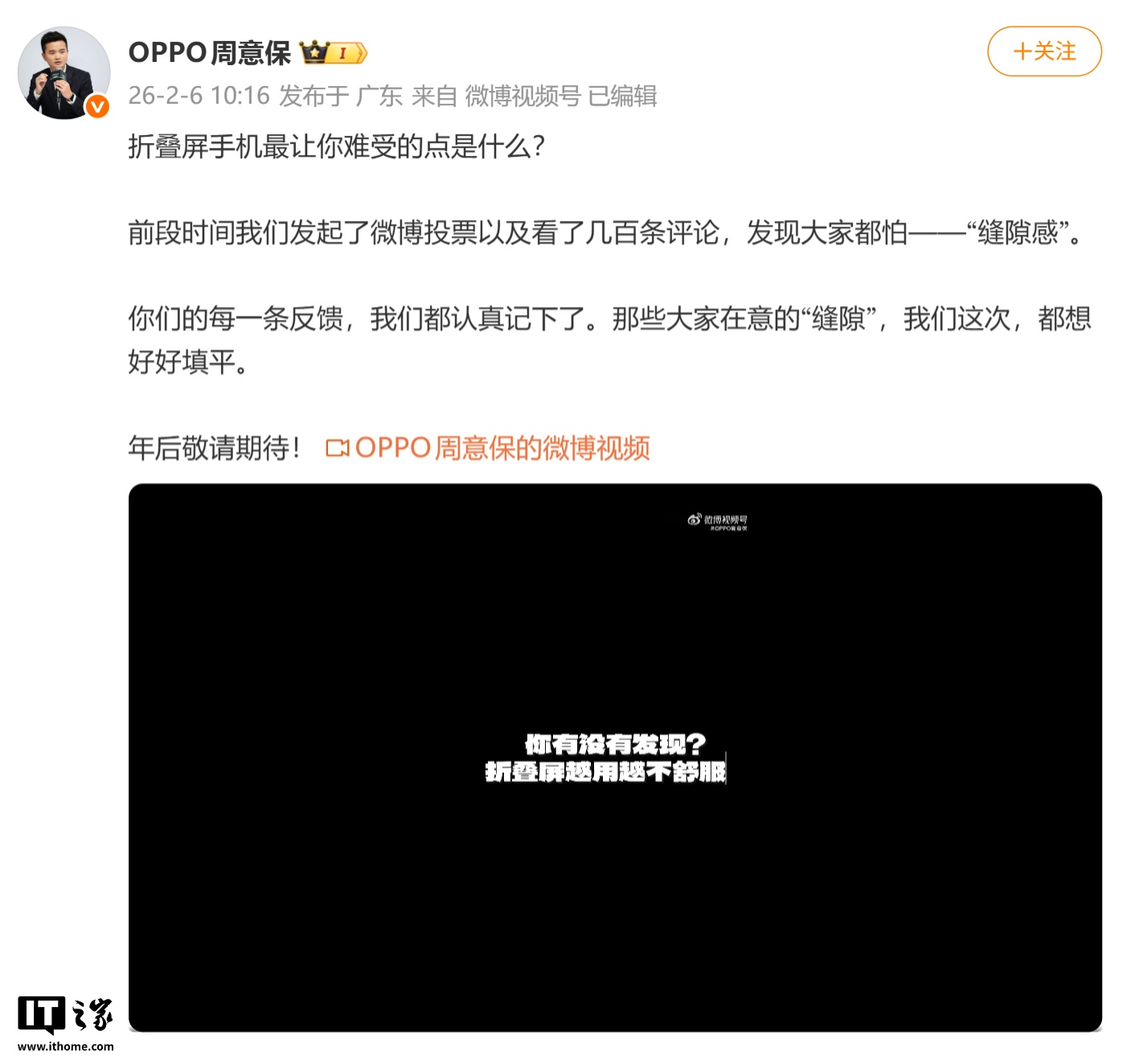IT之家 2 月 6 日消息,OPPO Find 系列产品负责人周意保今天在微博发文,预热一款折叠屏手机新品,年后敬请期待。