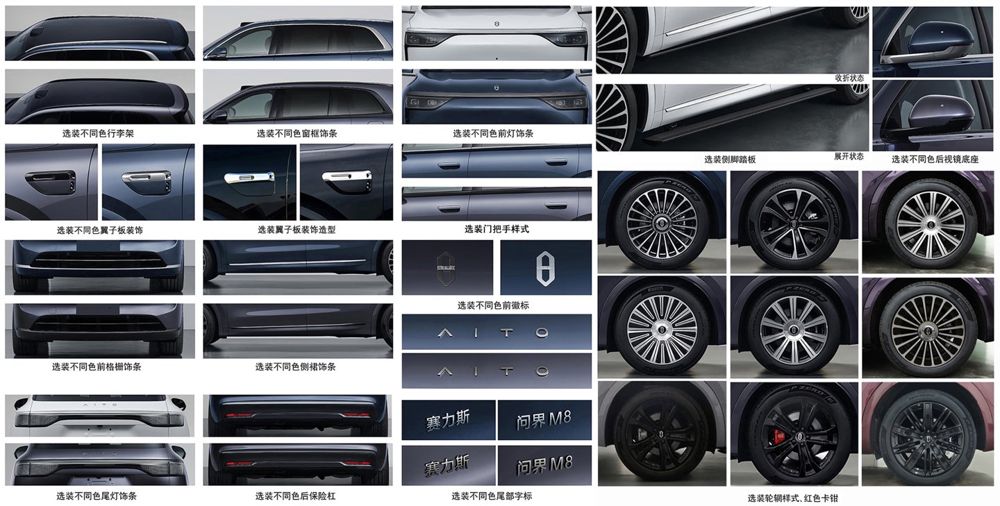 新车可选装不同色行李架、窗框饰条、后视镜底座、前格栅饰条、后保险杠、侧裙饰条、翼子板装饰、前灯饰条、尾灯饰条、前徽标、尾部字标、辋样式、红色卡钳、侧脚踏板、门把手样式、翼子板装饰造型。