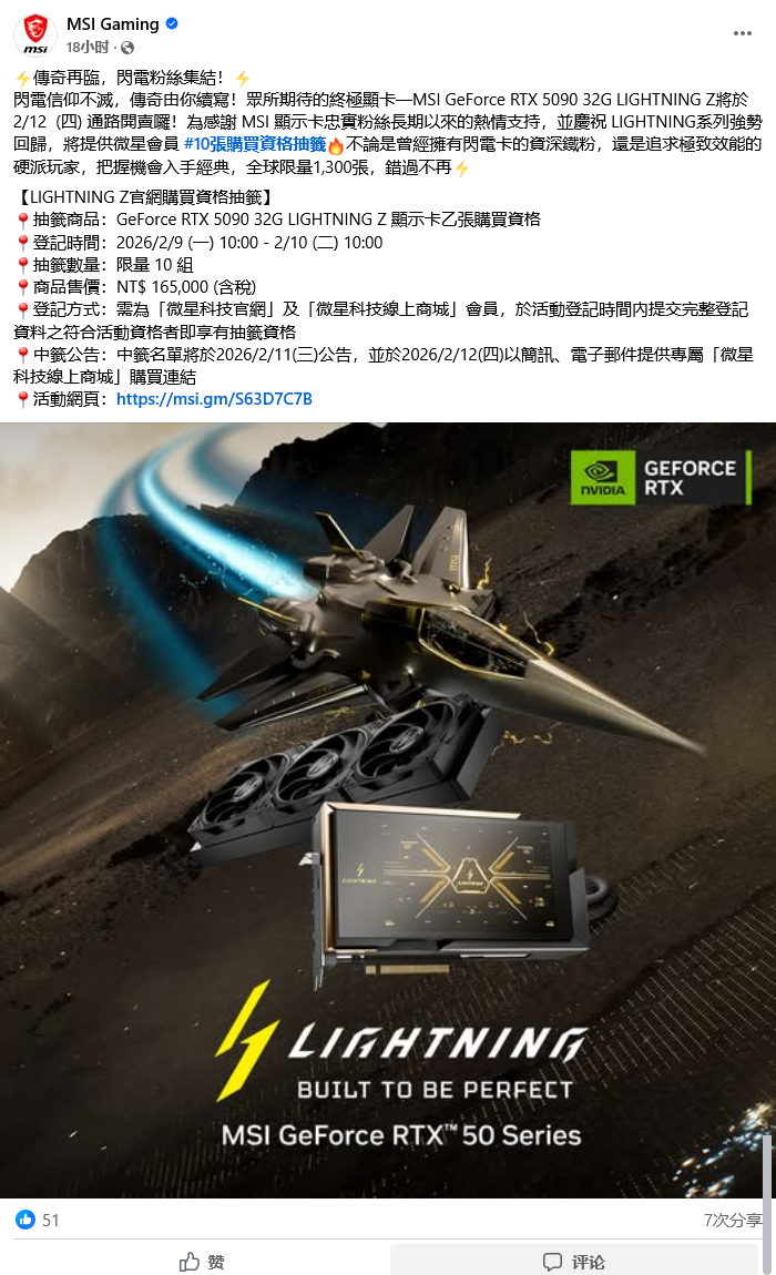 IT之家 2 月 7 日消息,微星 (MSI) 官方昨日宣布,其旗舰显卡 GeForce RTX 5090 32G LIGHTNING Z“闪电”即将于 2 月 12 日(下周四)在中国台湾地区市场的渠道通路开卖。