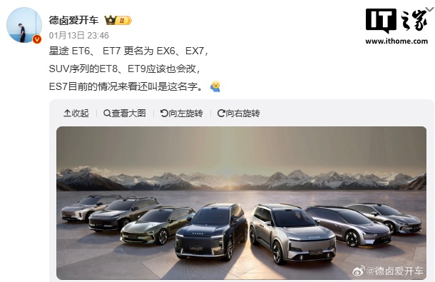 IT之家注意到,博主 @德卤爱开车 于今年 1 月发文透露,星途 ET6、 ET7 更名为 EX6、EX7。