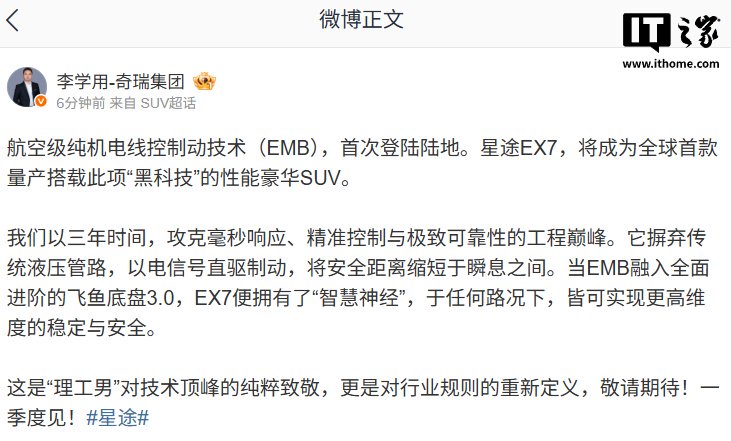 IT之家 2 月 7 日消息,奇瑞汽车执行副总裁李学用今日宣布,航空级纯机电线控制动技术(EMB),首次登陆陆地。星途 EX7,将成为全球首款量产搭载此项“黑科技”的性能豪华 SUV,一季度见。