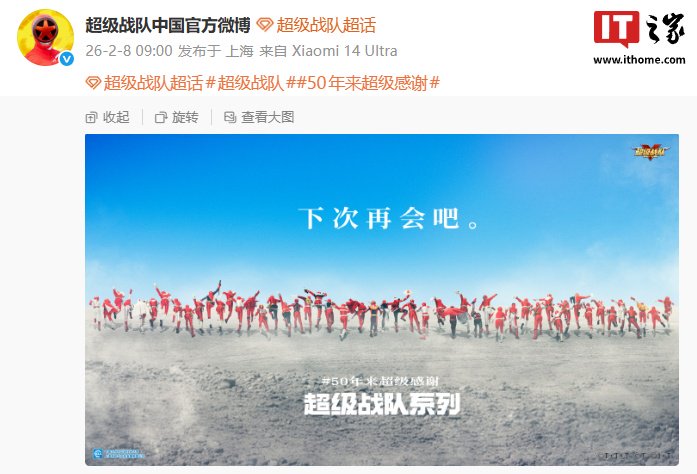 IT之家 2 月 8 日消息,《超级战队》系列作品官方微博今日发布“50 年来超级感谢”,并表示“下次再会吧”。至此,连载半世纪的日本三大特摄之一的《超级战队》暂告一段落(与《奥特曼》《假面骑士》并称日本三大特摄)。