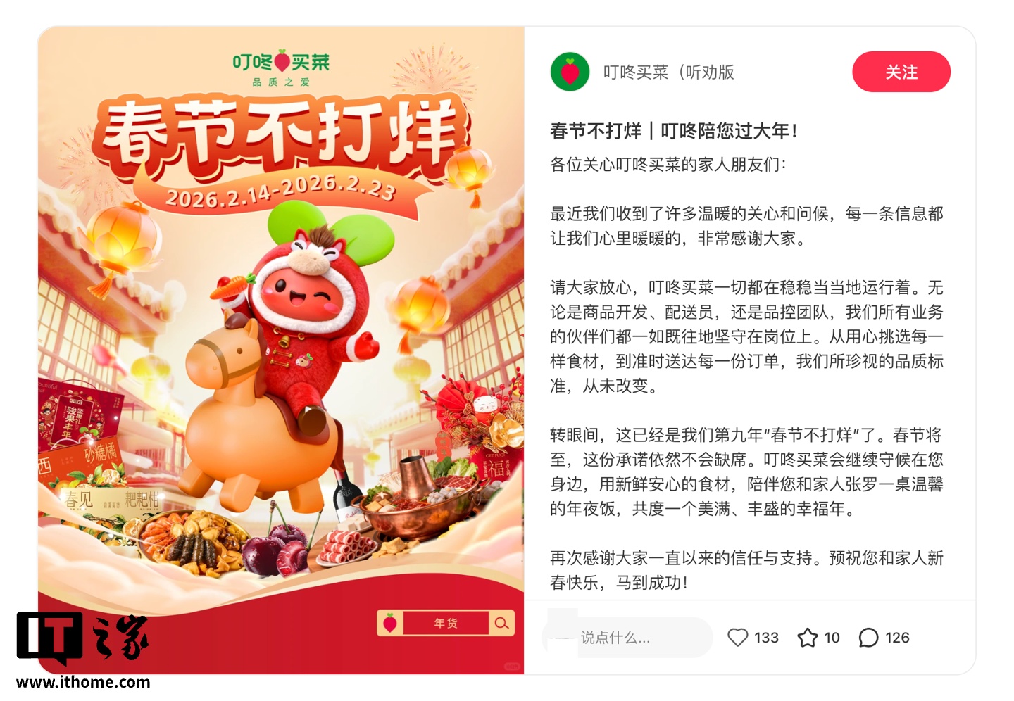 IT之家 2 月 9 日消息,今天午间,叮咚买菜通过官方小红书账号发文称:目前叮咚买菜业务及团队均在正常、稳定运行中,将一如既往地为大家提供高质量的商品和服务。官方还表示,今年叮咚买菜将实行第九年春节不打烊,各业务团队将全方位保障用户的春节消费体验。