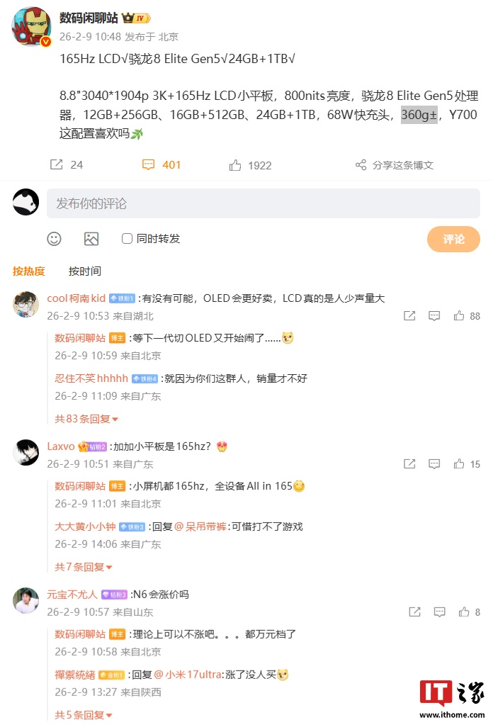 有网友表示 OLED 屏幕会更好卖,博主回复称:“等下一代切 OLED 又开始闹了……”有网友询问一加小平板的屏幕是否为 165hz 高刷,博主表示:“小屏机都 165hz,全设备 All in 165。”还有网友询问 OPPO Find N6 是否会涨价,博主坦言:“理论上可以不涨吧。。。都万元档了。”