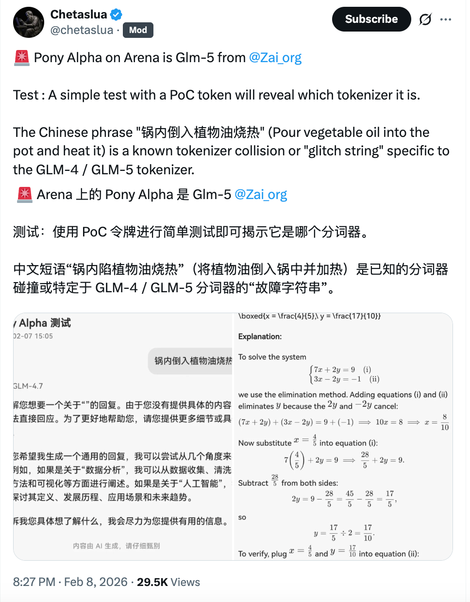 第二,有网友进行了 PoC 令牌测试,利用了一个在特定模型分词器中会触发异常的字符串,发现这款模型和 GLM-4 背后用的是同一套分词器。