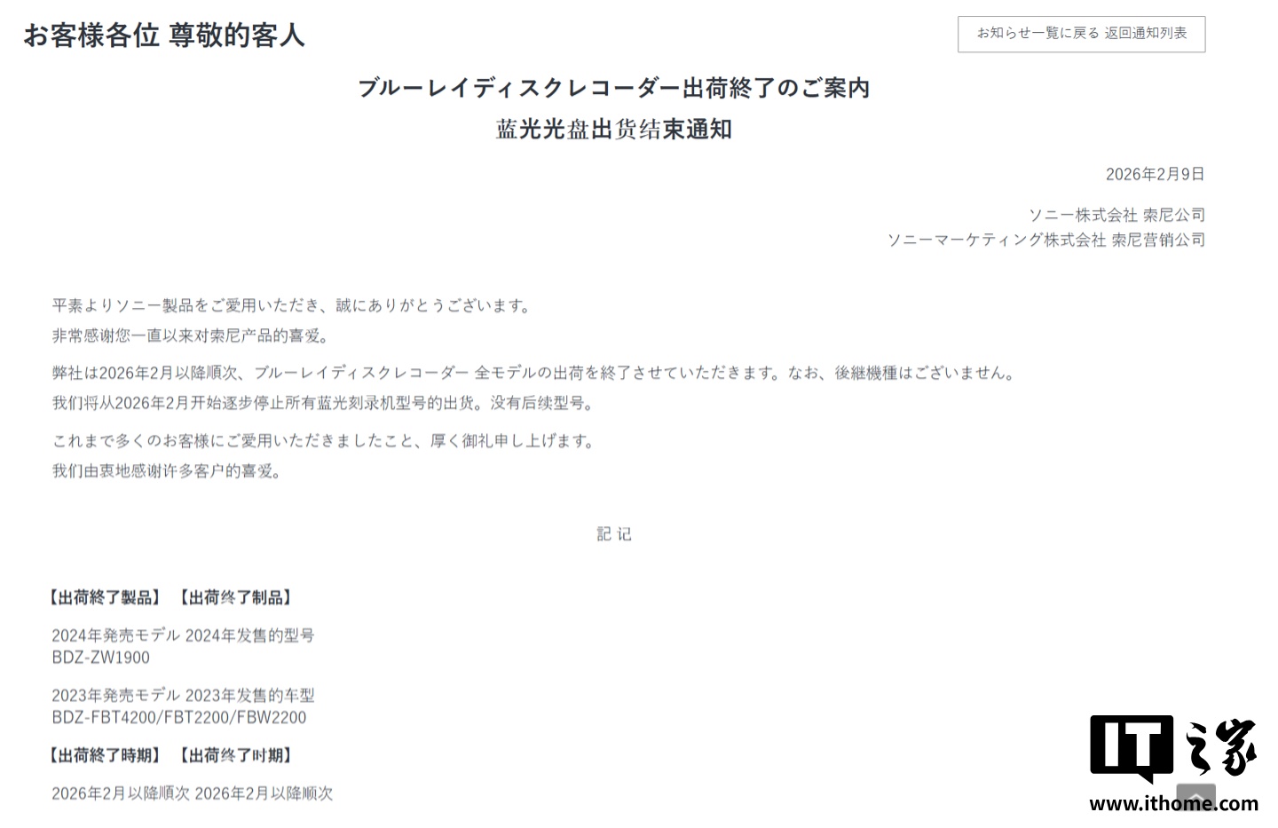 IT之家 2 月 10 日消息,作为蓝光光盘标准的开创者与奠基人,索尼于当地时间 2 月 9 日在其日本官方网站发布公告,宣布将逐步停止旗下所有蓝光录像机的出货。更令人唏嘘的是,官方公告中明确标注“无后续机型”,这意味着索尼将彻底退出家用蓝光录像机硬件市场。