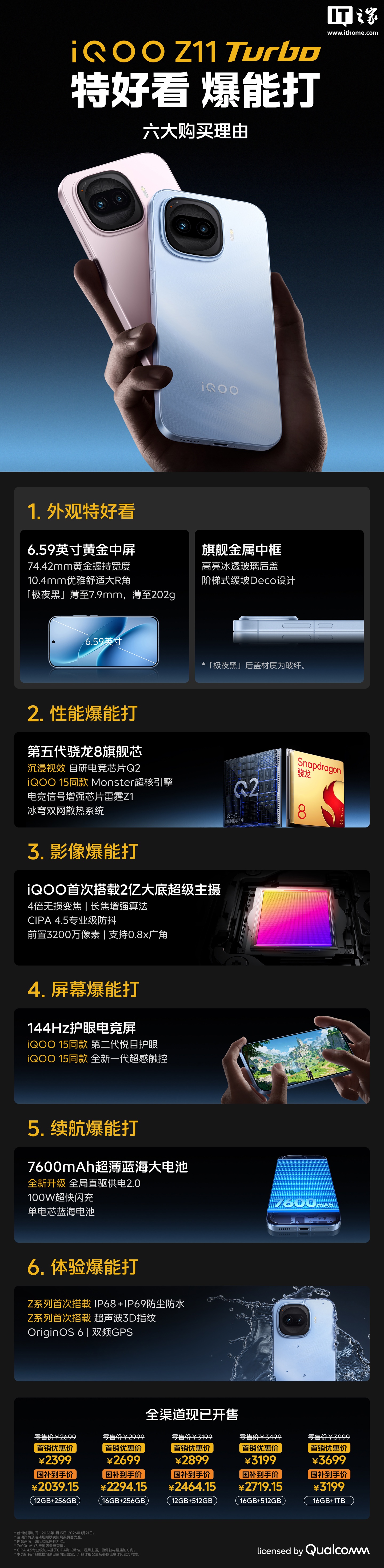据IT之家此前报道,iQOO Z11 Turbo 手机已于 1 月 15 日发布,搭载第五代骁龙 8 处理器与 2 亿主摄、配备 6.59 英寸 2750×1260 OLED 黄金中屏,售价 2699 元起。