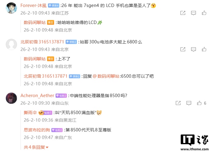 有网友感叹:“26 年能出 7sgen4 的 LCD 手机也算是圣人。”博主回复称:“哈哈哈哈难得的 LCD。”还有网友询问 vivo X300 Ultra 手机能否配备 6800mAh 电池,博主则表示:“上不了。”