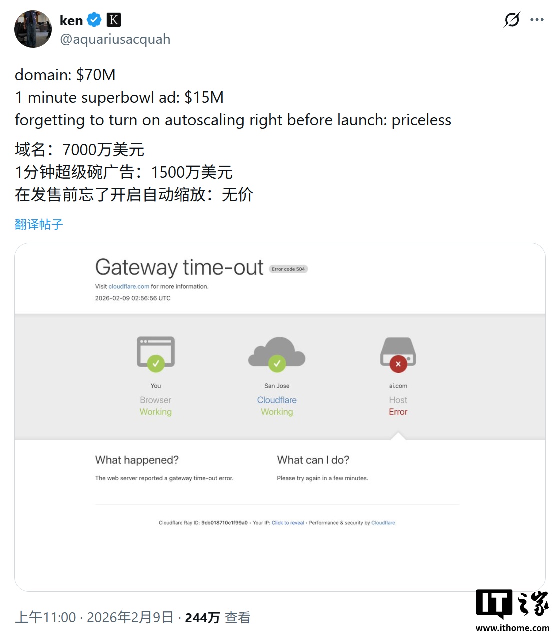 IT之家 2 月 10 日消息,科技媒体 Tom's Hardware 昨日(2 月 9 日)发布博文,报道称 AI.com 于周日晚在超级碗(Super Bowl)投放广告,此次营销投入了约 8500 万美元(含 7000 万美元域名费和 1500 万美元广告费),但由于网站崩溃,让这场天价域名首秀演变成一场灾难。