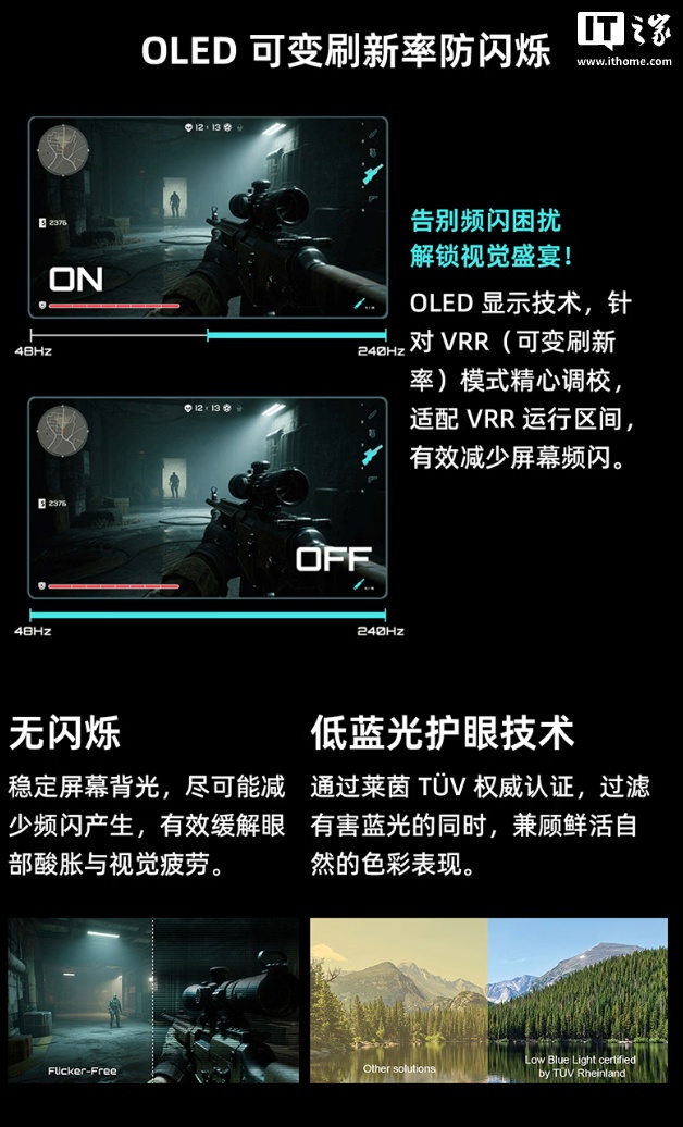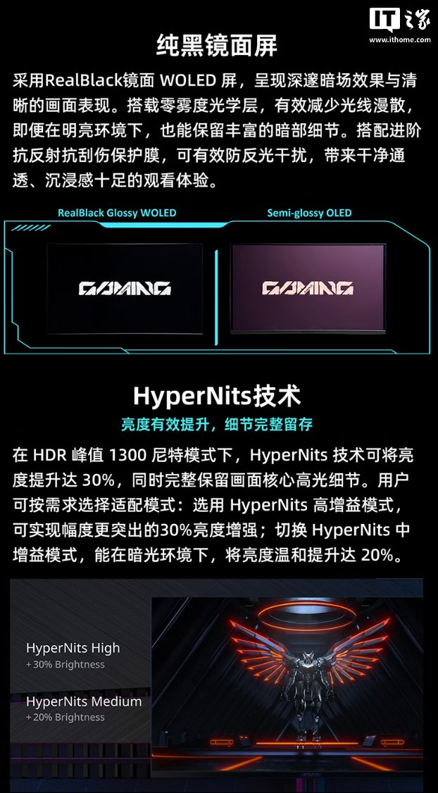 规格方面,这款显示器搭载镜面 W-OLED 面板,能够有效减少光线漫射,支持 10Bit 色深,覆盖 99% DCI-P3 色域,满足游戏之余的观影、修图需求,GTG 响应时间为 0.03ms,让用户在 FPS 游戏中抢占先机,兼容 G-Sync 防撕裂技术。