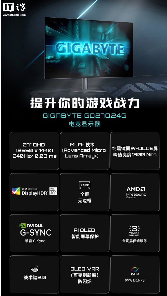 IT之家 2 月 10 日消息,技嘉 GO27Q24G 显示器现已在京东开启新品预约,新品主打重度电竞用户,搭载 27 英寸 2K 240Hz W-OLED 面板,标价 2599 元。