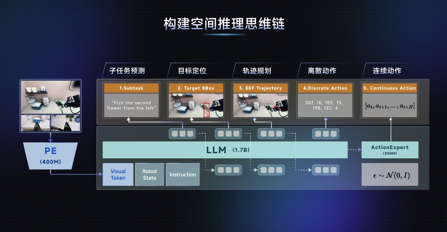 通过构建“空间推理思维链”,DM0 能够将环境感知、任务理解、运动规划与精细执行串联成闭环,完成需要多步骤空间推理的广义动作。