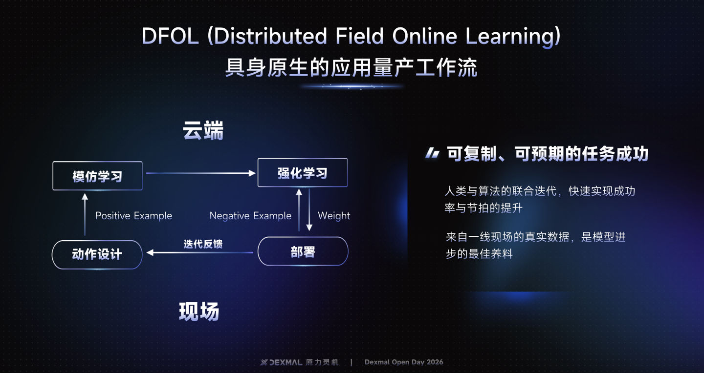 面向量产应用的 DFOL 工作流同步亮相,其核心是通过 " 硬件通用 + 模型智能 " 模式,建立“云端训练-现场执行-数据回流-模型更新”的持续进化闭环。